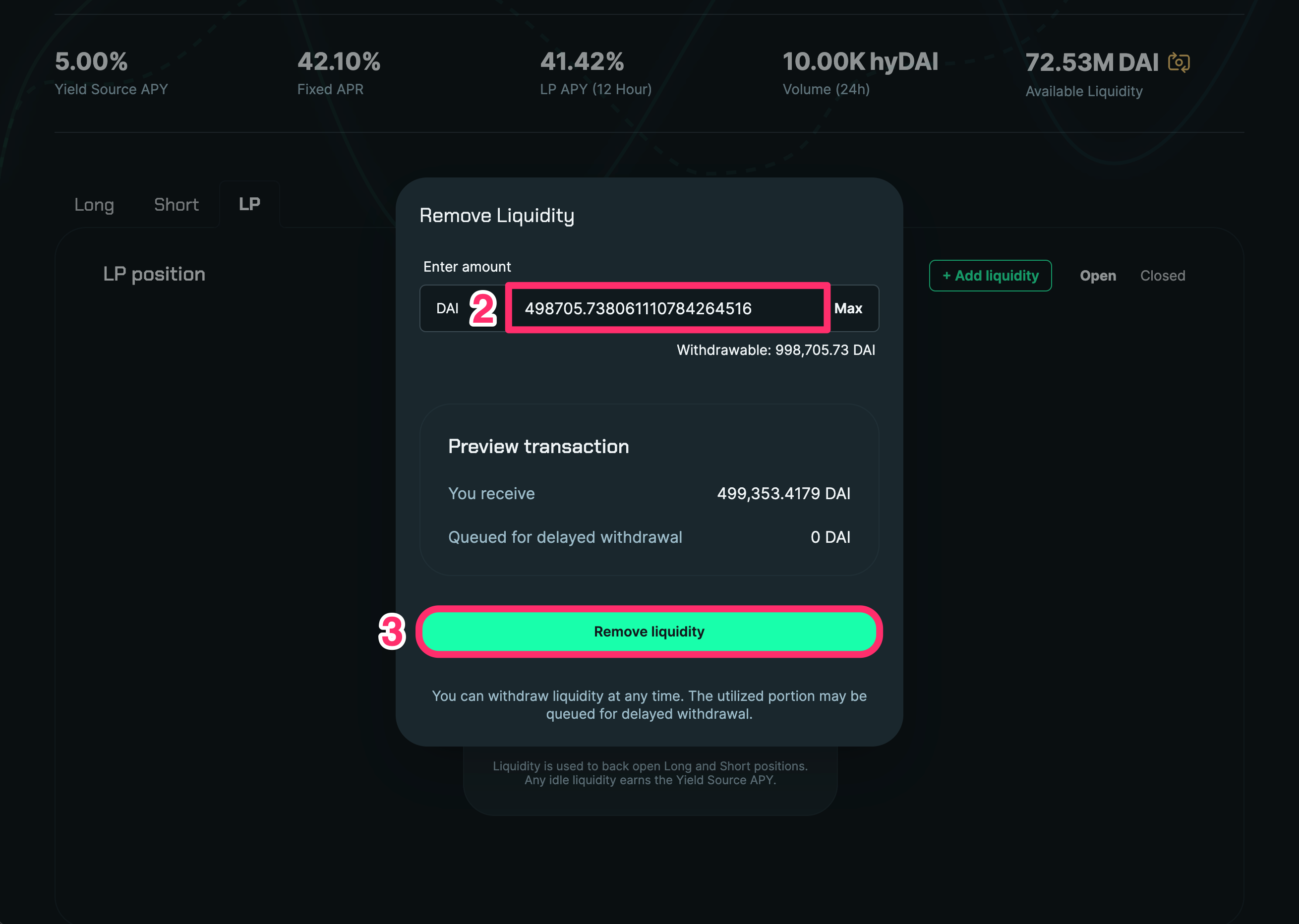 1. Click on the **Remove Liquidity** button on your LP position under the **LP** tab of the page.