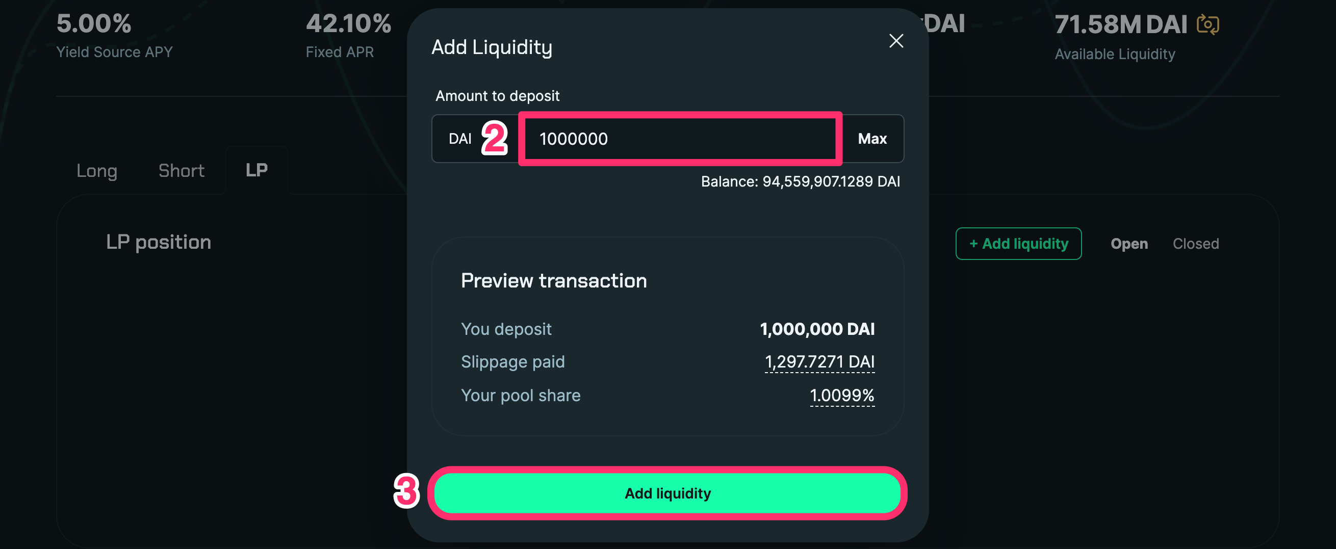 2. Input the amount you want to deposit. You can review the resulting position here before proceeding.