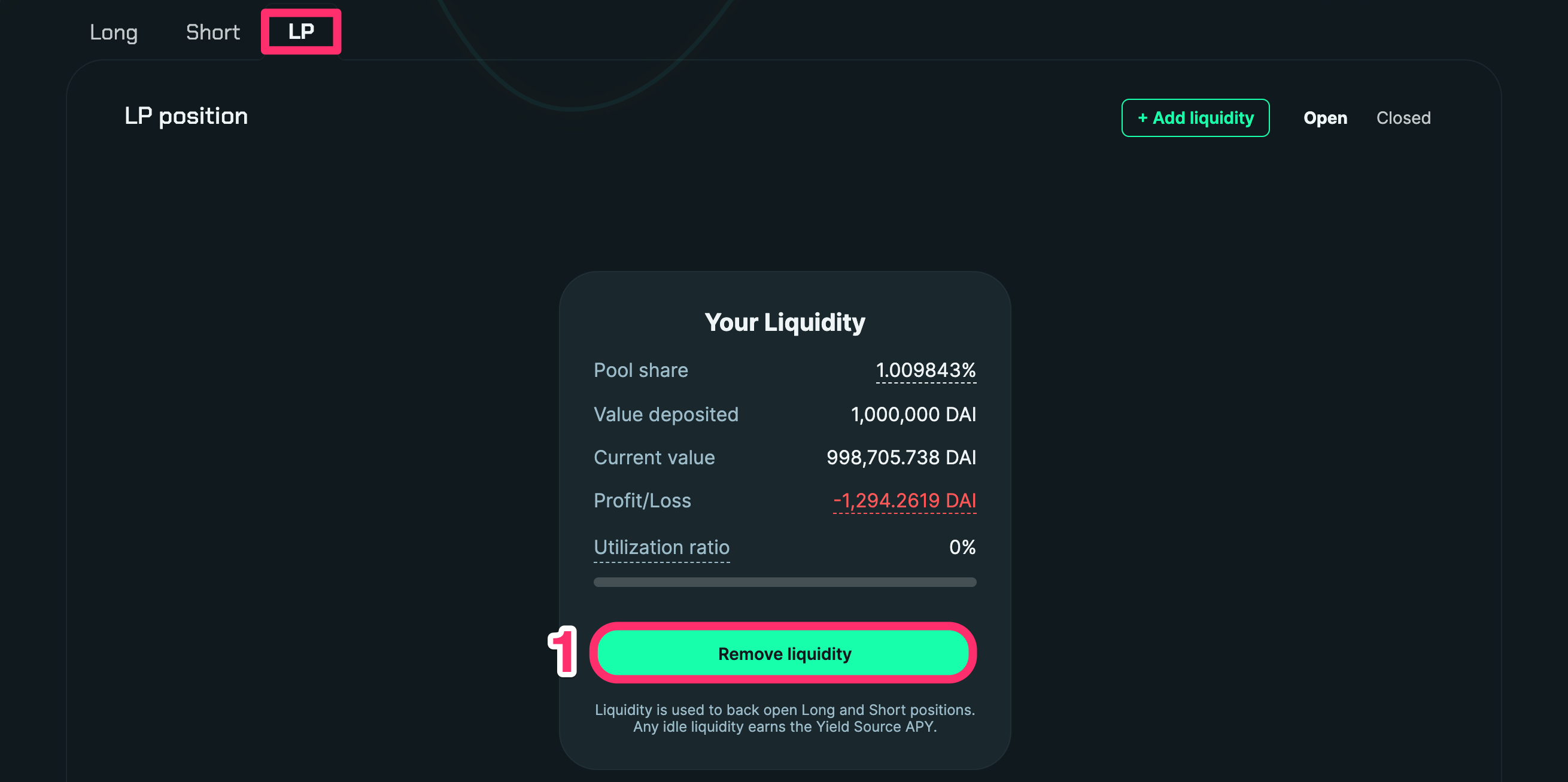 Once the transaction is executed on the blockchain, your open position will be listed on the **LP** tab.