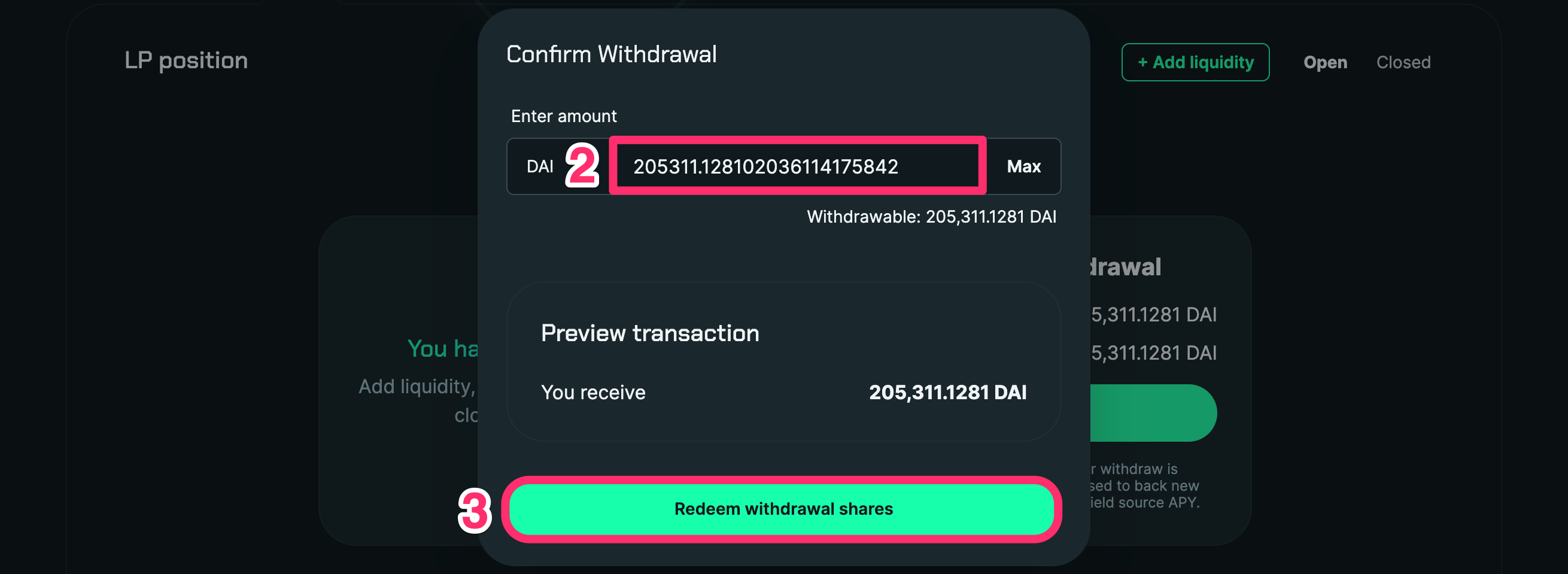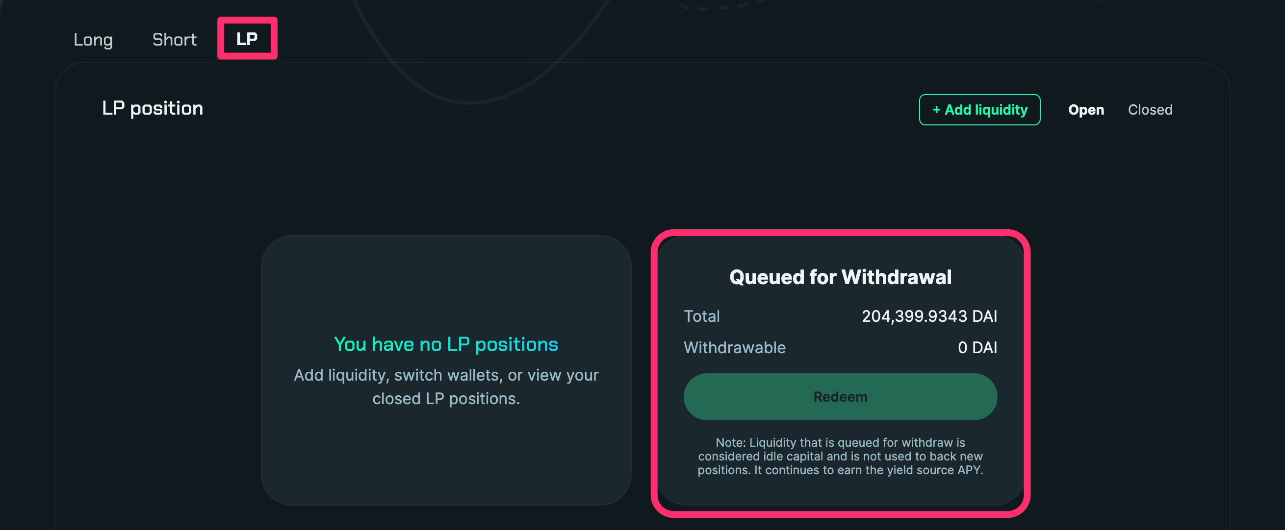 1. Find your **Queued withdrawal** under the **LP** tab in the page and click on the **Redeem** button. A form will pop up.